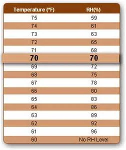 Keeping cigars properly humidified is the single most important factor in determining a cigar’s inherent smokeability. A cigar that is too dry smokes too hot and ashy and can unravel. A cigar that is too moist can make a comfortable draw almost impossible. Whether you are holding your cigars in a humidor (recommended), a cabinet, a cellar or a window sill, the trick is to balance the right air temperature with the right relative humidity. The chart below shows the proper relative humidity for different temperatures.